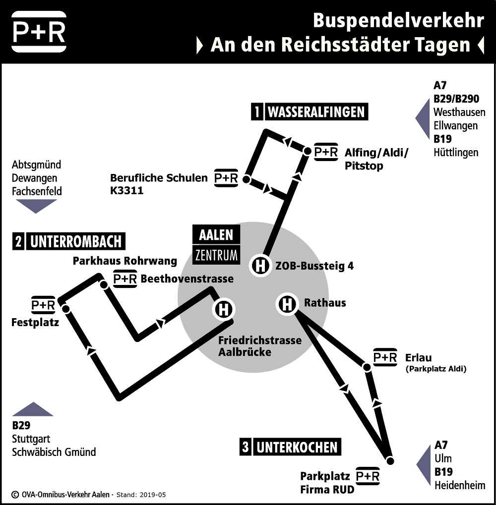 Damit möglichst viele Besucher/innen ihre Autos zu Hause lassen, wird auch in diesem Jahr der „Reichsstädter Tage Bus-Pass“ als übertragbarer Fahrschein von Freitag ab 18 Uhr bis Sonntagabend auf allen Strecken im Stadtgebiet Aalen angeboten. Der Fahrschein wird von der Stadt und vom BdS-Gewerbe- und Handelsverein bezuschusst. Erwachsene bezahlen einmalig für die Fahrten 4,00 Euro, Kinder bis zu zehn Jahren 2,30 Euro und können dafür beliebig oft den Bus benutzen.