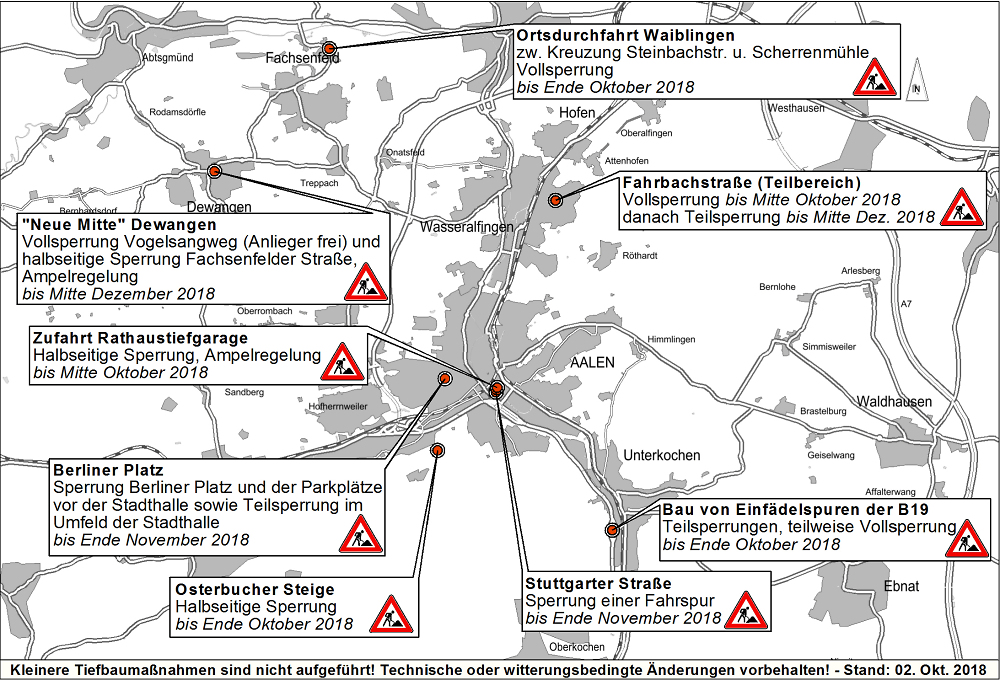 Es ist möglich, dass sich die Termine aufgrund technischer oder witterungsbedingter Umstände ändern. Der nächste Baustellenplan erscheint im November 2018. Die Stadt Aalen bittet Anwohner und Verkehrsteilnehmer um Verständnis für mögliche Behinderungen.