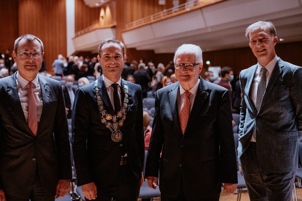Rund 350 geladene Gäste und Besucher*innen verfolgten die Veranstaltung, bei der Erster Bürgermeister Wolfgang Steidle die Begrüßung übernommen, Regierungspräsident Wolfgang Reimer die Festansprache gehalten sowie Landrat Dr. Joachim Bläse ein Grußwort gesprochen hatte. Allesamt sprachen sie von einem enormen Vertrauensvorschuss durch die Wahl am 4. Juli 2021 mit 71,2 Prozent der Stimmen. Erster Bürgermeister Wolfgang Steidle hieß Frederick Brütting in der Mitte der Stadtverwaltung mit ihren 1200 Mitarbeitenden willkommen und überreichte eine riesige Box mit kleinen Geschenken aus den einzelnen Ämtern. „Sie werden viel hinzugewinnen. In unserer lebenswerten Stadt werden Sie die erfolgreiche Politik weiterentwickeln. Dass Oberbürgermeister gestalten können, hat Thilo Rentschler bewiesen.