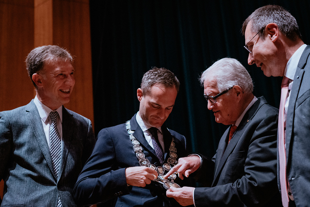 Thomas Wagenblast hob in seiner Funktion als erster ehrenamtlicher Stellvertreter des Oberbürgermeisters darauf ab, dass dem Vertrauen in der Position des Oberbürgermeisters eine Schlüsselfunktion zukomme – als wichtigster Ressource in der Politik allgemein. „Vertrauen trägt auch einen Oberbürgermeister – mehr als das Glitzern seiner Amtskette“, sagte Wagenblast. Er bot OB Brütting im Namen aller Gemeinderätinnen und Gemeinderäte eine konstruktive, vertrauensvolle und verlässliche Zusammenarbeit im Gemeinderat an. „Wichtig ist uns, dass wir uns auf Sie und die Verwaltung verlassen können“, sagte Wagenblast. Sehr viele Aufgaben seien zu bewältigen. In den Diskussionen und Konflikten empfiehlt er dem OB eine ordentliche Portion Gelassenheit. Wagenblast nahm OB Brütting den Amtseid ab und legte ihm die Amtskette als Insignie seiner Autorität um.