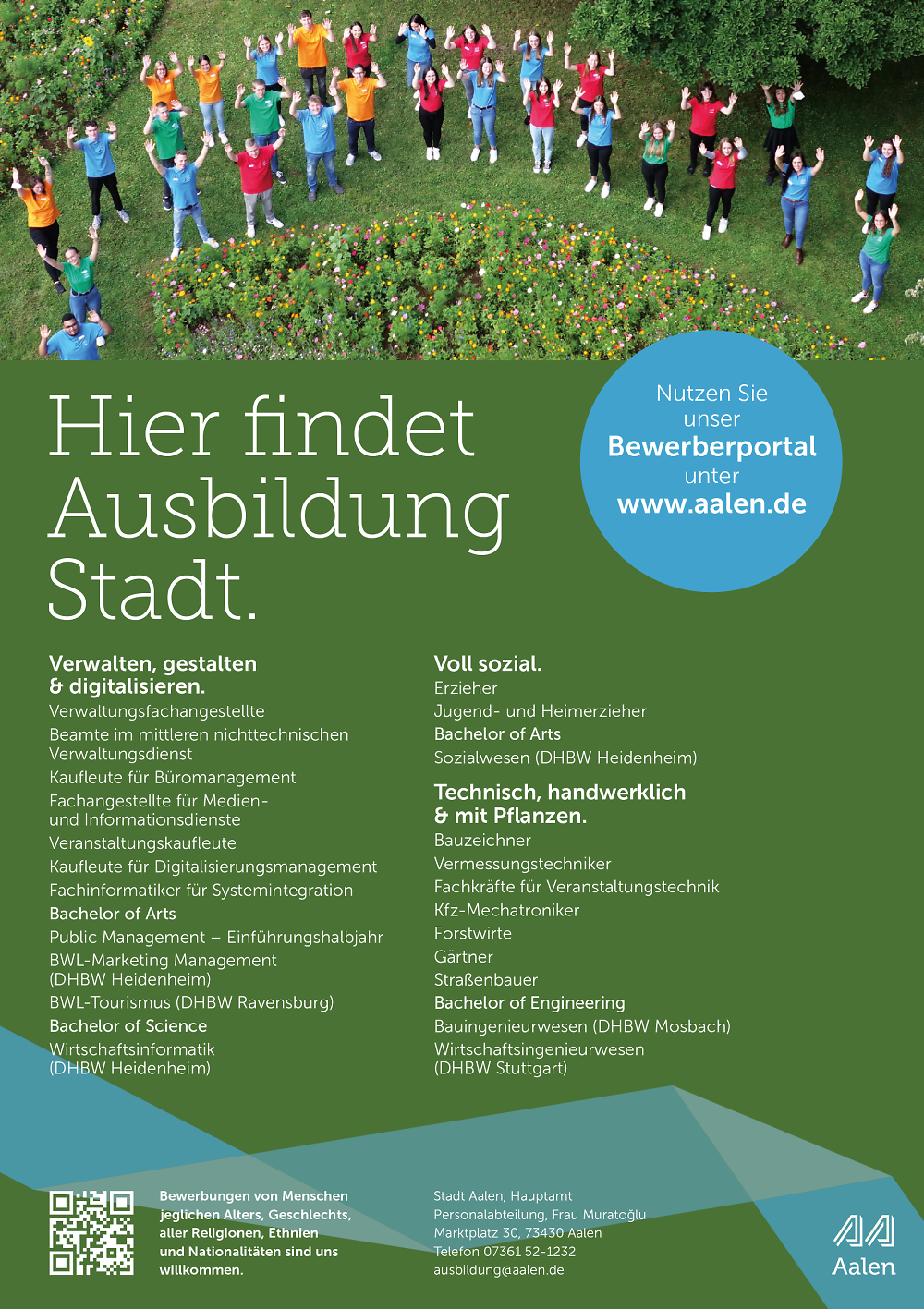 Mit rund 1.400 Mitarbeitenden gehört die Stadt Aalen zu den größten Arbeitgebern in der Region – und bietet Ihnen damit beste Voraussetzungen für eine spannende und vielseitige Ausbildung. Ob Verwaltung, soziale Berufe oder ein duales Studium in Zusammenarbeit mit den Dualen Hochschulen: Bei uns finden Sie genau den richtigen Einstieg in Ihre berufliche Zukunft.