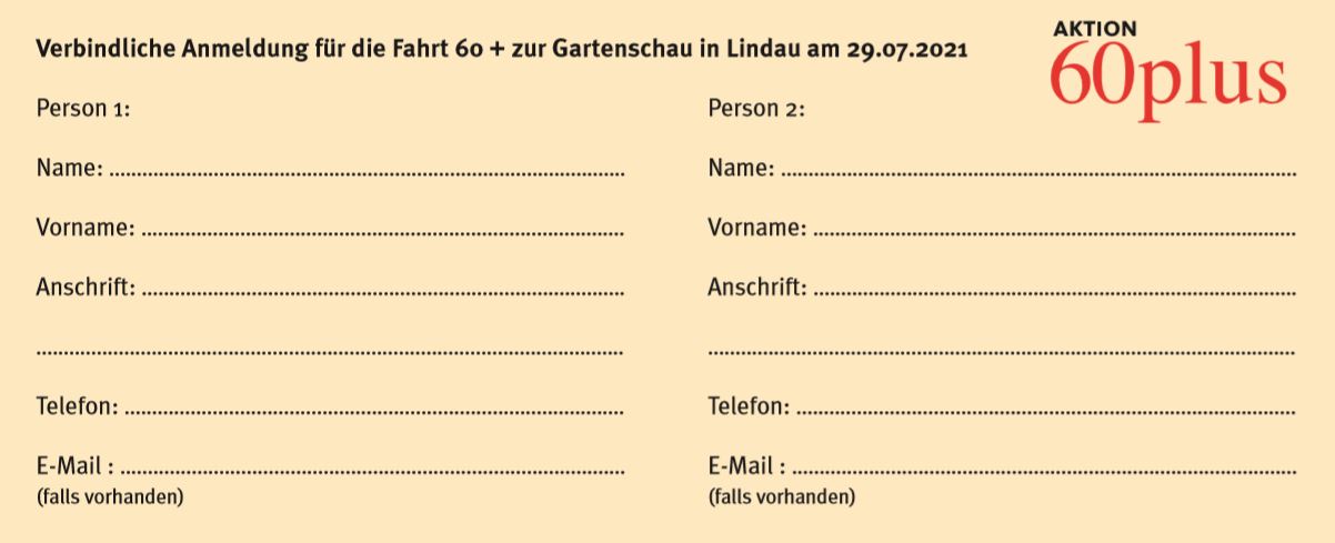 Nachdem es im vergangenen Jahr wegen Corona keine 60+-Fahrten gab, möchten wir in diesem Jahr wieder eine Fahrt anbieten – im Sommer und mit einem attraktiven Ziel im Freien.