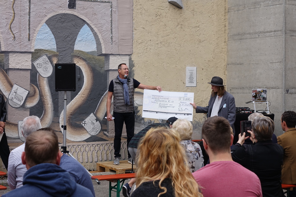 Der Dank des Künstlerkollektivs galt neben der Stadt der Eigentümerfamilie Kayser sowie Farben Jedele und den beteiligten Handwerkern, die Hilfestellungen beim Bemalen der Außenwände geleistet hatten. „Ich animiere Sie alle, den jungen Künstlern ihre Aufmerksamkeit sowie Geld zu spenden. Ich möchte die Idee einer Jugendkunstschule diskutieren, damit junge Menschen noch stärker künstlerisch tätig sein können und die Stadtgesellschaft wie dieses Projekt noch stärker befruchten“, sagte OB Rentschler, nachdem er den symbolischen Scheck über 4000 Euro überreicht hatte.