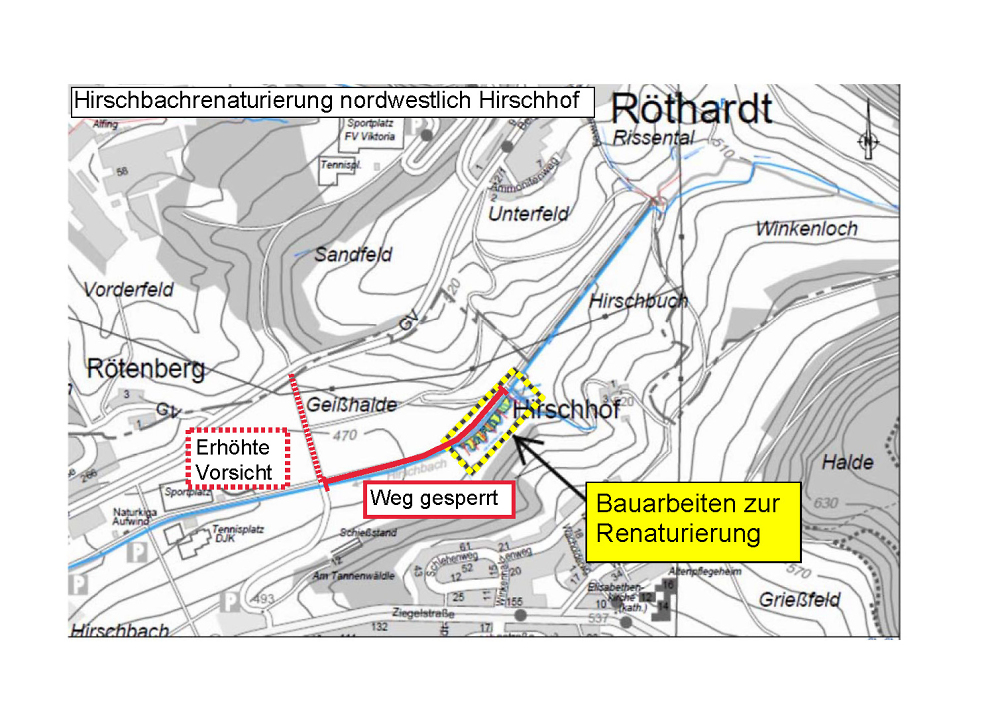 Der Spazier- und Radweg im Hirschbachtal muss voraussichtlich bis Mitte Dezember für die Anfahrt zur Baustelle gesperrt werden. An den Wochenenden und sofern es der Baustellenbetrieb zulässt bleibt der beliebte Spazierweg für Radfahrer und Fußgänger geöffnet. Es wird gebeten die Ausschilderung zu beachten.