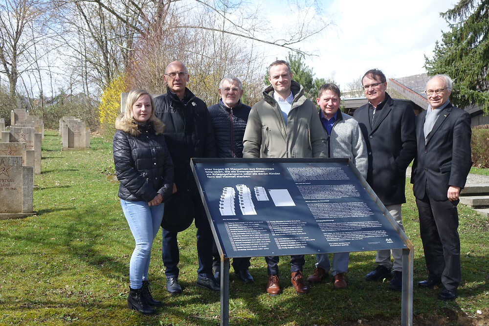 Eine neu aufgestellte Informationstafel auf dem Unterrombacher Friedhof klärt über ein Gräberfeld osteuropäischer Zwangsarbeiter*innen und Kriegsgefangene auf.