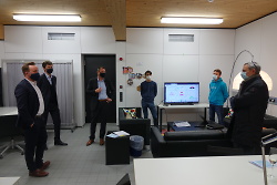 Prof. Schneider hob anerkennend das hohe technische Niveau der Erfindung und die gelungene Umsetzung des Prototyps unter Anwendung verschiedenster Technologien hervor. Er ließ sich die Funktionsweise des smarten Blindenstocks erläutern. Thomas Bayer entwickelt an dem mit Künstlicher Intelligenz versehenen Gerät seit rund einem Jahr.