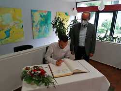 „Ein Meister fällt nicht vom Himmel, aber Sie sind von klein auf in die Materie hineingewachsen, haben sich immer weiter qualifiziert und sind jetzt sogar Deutscher Meister im Ofenbau“, sagte Bürgermeister Karl-Heinz Ehrmann bei einem kleinen Empfang für Jannik Schebesta im Aalener Rathaus. Er gratulierte dem 20-Jährigen im Namen der Stadt zu diesem tollen Erfolg für sich selbst, den elterlichen Betrieb, aber auch die Stadt Aalen samt Kreishandwerkerschaft und Handwerkskammer. Gute Handwerker seien immer gern gesehen und der Titel Deutscher Meister sei natürlich auch ein Aushängeschild für die Branche. Und damit folgte der feierliche Eintrag ins Goldene Buch der Stadt.