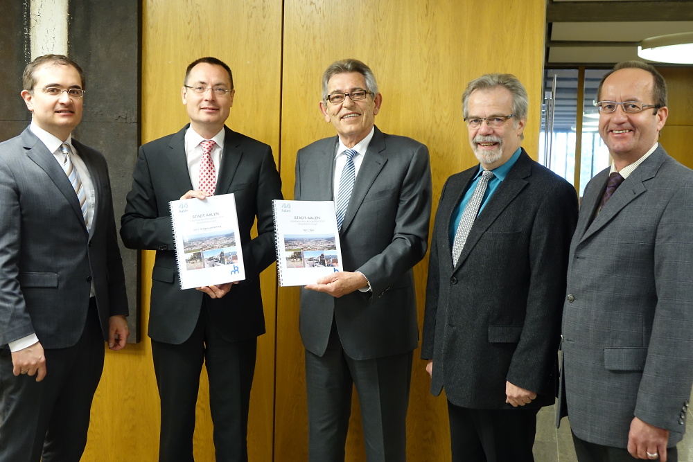 Dr. Ing. Manfred Brenner und Dipl.-Ing. Ulrich Noßwitz vom ausführenden Ingenieurbüro, überreichten am Mittwoch das rund 200 Seiten umfassende Planwerk an Oberbürgermeister Thilo Rentschler und die Dezernenten Wolfgang Steidle und Karl-Heinz Ehrmann.