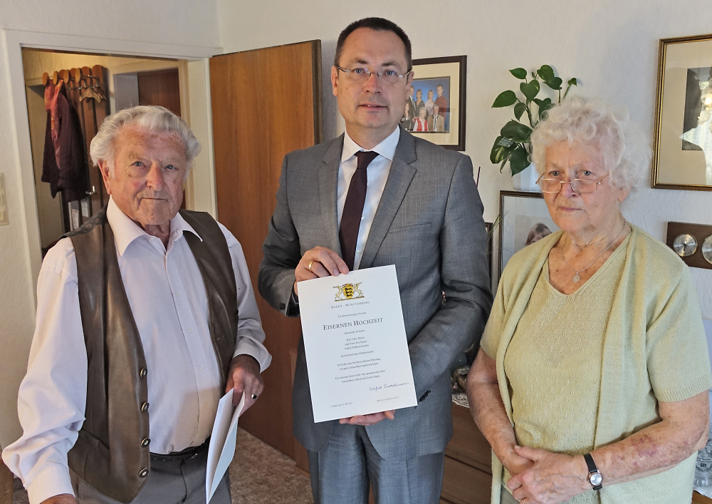 Bei guter Gesundheit empfingen Ilse und Otto Maier OB Thilo Rentschler an ihrem 65. Hochzeitstag. Im Kreise ihrer Kinder und Enkelkinder feierte das Ehepaar in ihren eigenen vier Wänden Eiserne Hochzeit. Rentschler unterhielt sich mit den Jubilaren über diverse Themen. Er hatte neben einem Geschenkkorb eine Glückwunschurkunde des Ministerpräsidenten mit dabei. „Ich freue mich, dass Sie sich selbst versorgen können und im eigenen Heim ihren Lebensabend verbringen können“, sagte Rentschler.