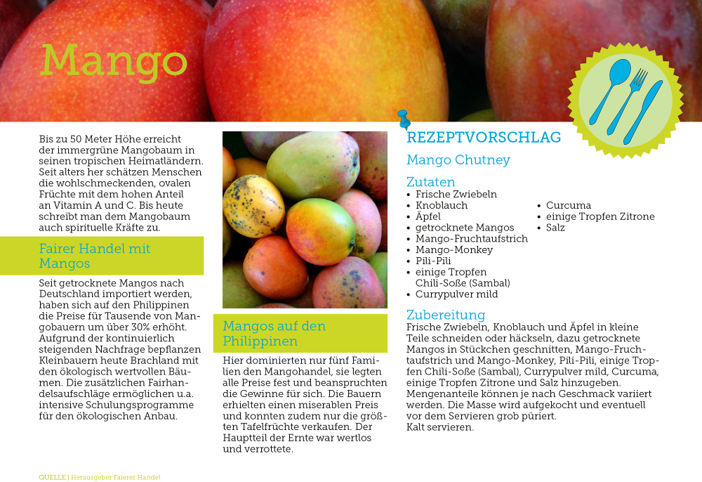Seit getrocknete Mangos nach Deutschland importiert werden, haben sich auf den Philippinen die Preise für Tausende von Mangobauern um über 30% erhöht. Aufgrund der kontinuierlich steigenden Nachfrage bepflanzen Kleinbauern heute Brachland mit den ökologisch wertvollen Bäumen. Die zusätzlichen Fairhandelsaufschläge ermöglichen u.a. intensive Schulungsprogramme für den ökologischen Anbau.