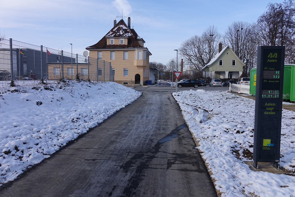 „Am Wegrand wurde dauerhaft ein so genannter ECO-Counter aufgestellt, der die Anzahl der vorbeifahrenden Radfahrer digital erfasst und auf einem Display anzeigt“, erklärte Erster Bürgermeister Wolfgang Steidle. So werde die Nutzungshäufigkeit des neuen Radweges sichtbar. Gezählt werden nur Radfahrer. Während der ersten Tage nach der Öffnung waren trotz des winterlichen Wetters pro Tag mehrere Dutzend Radler auf der neuen Verbindung unterwegs. Im Frühjahr 2021 wird die Trasse des Radwegs unter der Bahnlinie an der Wilhelm-Merz-Straße fortgeführt und verbreitert. „Die Planungen zur verbesserten Anbindung an die Industriestraße laufen ebenfalls“, sagte Wolfgang Steidle.